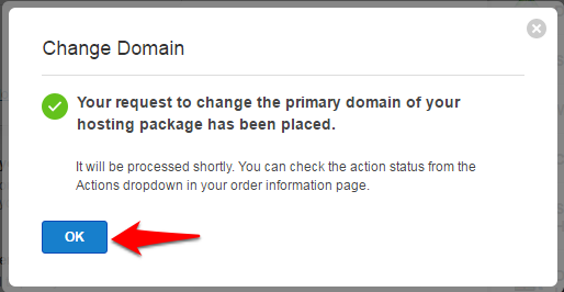 • The primary domain name of the hosting package cannot be modified if the new domain does not exist in your account. You will need to use a domain that you have registered in your account.