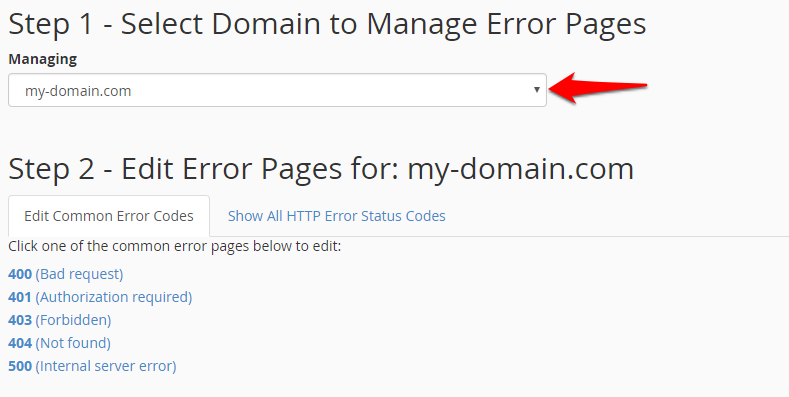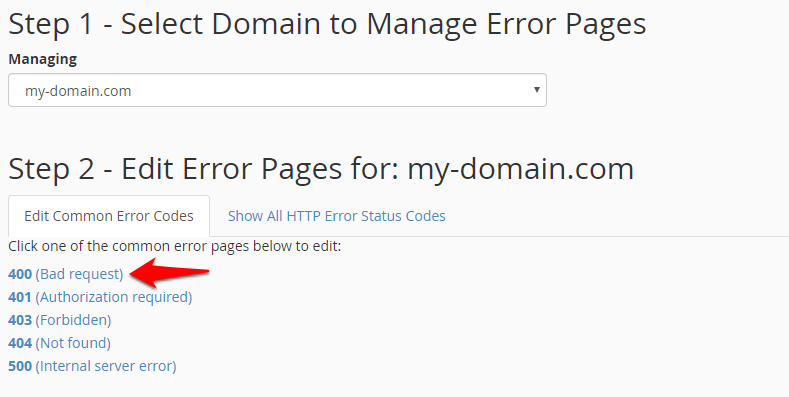 • Click on the error page you wish to customize.