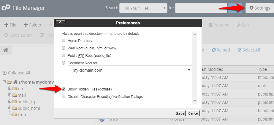 • If you are unable to find the .htaccess file, ensure the Show Hidden Files option is selected.